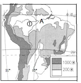 (1)图中A地形区是 ,植被类型是 ,该植被类型还分布在非洲的 和亚洲的 地区。(4分)
