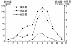 5、单选题 图为“我国某河流中游水文观测站多年月平均降水量、径流量、输沙量变化图”。读图回答问题。