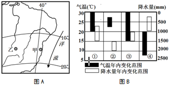 【小题1】读图A,根据经纬度判断是巴西,甲是热带雨林气候。根据图B判断,①是热带草原气候,②是热带雨林气候,③是热带季风气候,④是地中海气候。所以B对。