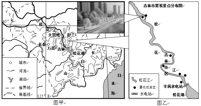 材料一 雾凇(俗称“树挂”)是严寒季节里空气中过饱和水汽遇冷附着于地面物体凝华而成。吉林市区溯流而上十五公里,因修建丰满水电站而形成的巨大人工湖泊——松花湖,冬季尽管湖面一抹如镜、冰冻如铁,但从大坝底部水电站水闸放出来的湖水却是4℃,特定的条件让吉林雾淞驰名天下。“寒江雪柳日新晴,玉树琼花满目春”是吉林雾凇的真实写照。图甲为吉林省等高线图,图乙为吉林市雾淞景点分布图。