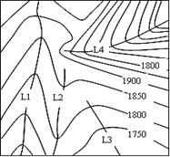 小题1:河流发源于山谷,即等高线凸向高处,因此L1、L3、L4为河流;L2是L1河与L3河的分水岭;等高线越密集,坡度越大,水流越急,因此D正确。