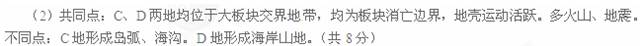 (2)用板块构造学说的理论,说明板块运动对C、D两地区地质运动和地形特征形成的异同点。(8分)