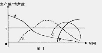 2、单选题 图1是某跨国企业产品在A、B、C、D四国的产量与消费量比值变化示意图,读图回答问题