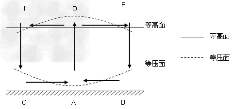 (1)在图中粗线上加上箭头表示大气运动的方向。 (2)A、B、D、E四处,气压最高的是________,最低的是________。 (3)若图表示热力环流,则A、B两地,温度较高的是________,日温差较大的是________。 (4)若图示情况出现在夏季,则A、B、C三处,______为陆地, ______为海洋。 (5)若下图表示三圈环流中的低纬环流,且B在北半球,则C为_______________带,AB间的风向为___________风。