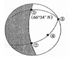 3、单选题 图中阴影区域为夜半球,①③两点的地方时刻相同但其所在弧线两侧的日期不同,②③两点日出、日落时间全年固定不变且两点的经度差为90°;④为②③两点之间弧线的中点。读图,回答下列各题。