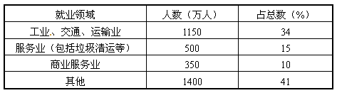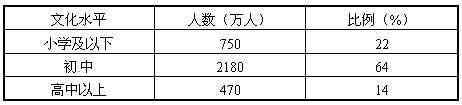 2、综合题 ? 据我国统计部门调查,1997年全国农村劳动力在县城和县城以上城市就业半年以上人数达3400万人,劳动力就业的地区分布、就业领域及文化水平如下表。
