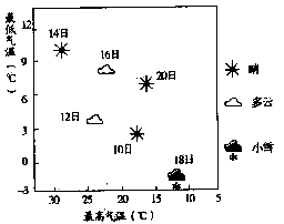 小题1:根据图中的最低气温和最高气温数值判断,该段时间气温变化幅度大,A错。18日有小雪天气,最高气温12°C,最低气温小于0°,北风寒冷,B错。前期气温升高,昼夜温差较大,晴天多,阴天少,C错。后期气温下降,并有降雪天气,4月份是春季,所以有倒春寒现象,D对。