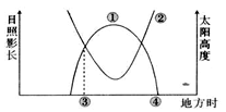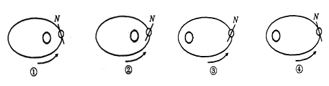 ![]() A.①曲线表示的是一日内太阳高度;②曲线表示的是一日内影长变化示意图 B.④点此刻的影长趋于无穷大 C.③点处影长方向指向东南 D.①点太阳高度大于26.5° 参考答案: 本题解析: 本题难度:一般 3、单选题 读图,阴影表示夜半球,内圆表示极圈,中心表示极点,箭头表示地球自转方向,其中北半球昼最短夜最长的是 参考答案:A 本题解析:北半球昼最短夜最长的是冬至日,北极圈是极夜现象,南极圈是极昼现象。符合的是A项。 本题难度:简单 4、单选题 由于大气的散射作用,人们把黄昏的余晖与黎明的曙光相接的现象叫“白夜”,白夜线是指白夜现象发生的最低纬度。下图中弧线BAC为晨昏线。当北半球发生白夜现象范围最大时,读图回答下列各题。 参考答案:1. B 本题解析:本题考查晨昏线的综合分析。 本题难度:困难 5、单选题 下列四幅表示地球绕日公转的示意图中,正确的是 参考答案:C 本题解析:本题考查地球的公转。地球公转经过近日点为1月初,太阳直射点应位于南半球,故②正确。地球公转经过远日点应为7月初,太阳直射点应位于北半球,故④符合。 本题难度:简单 |