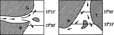 A.22日所占的经度的范围比23日大 B.22日所占的经度的范围比21日小 C.22日所占的经度的范围大约相当于21日的3倍 D.西半球的大部分和东半球的小部分属于21日 参考答案: 本题解析:略 本题难度:简单 2、多选题 造成昼夜长短变化的主要因素是 [? ] A.① B.② C.③ D.④ 参考答案:AC 本题解析: 本题难度:一般 3、综合题 ? 图2为极地投影图,图中ACB线是晨昏线,其中AC段是晨线,C点的纬度数值是66.5°;图1为地球绕日公转图,假设甲乙丙丁为两分两至日,①②两点为椭圆的两焦点。据此完成以下各题。 参考答案:(1)23.5°S;180°;北半球(或赤道及其以北) 本题解析: 本题难度:困难 4、单选题 下图是两条大河的河口图,图中的小岛因泥沙不断堆积而扩展,最终将与河的哪一岸相连? 参考答案:C 本题解析: 本题难度:简单 5、综合题 甲图中半圆弧是30°N纬线的一段。O为北极点,M、N分别为晨线和昏线与30°N的纬线的两个交点,∠MOX和∠NOY均为7.5°,OY为本初子午线;乙图是甲图Q点(70°N)一日之内的太阳视运动情况。据此完成下列问题。 参考答案:(1)172.5°E;(20°N,90°W);13个
