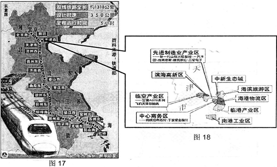 材料一图17为京沪高铁线路示意图。图18为天津滨海新区示意图。