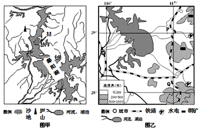 本题解析: (1)读图,M地位于鄱阳湖东岸,M周边多低山丘陵,有众多大大小小的支流注入,携带泥沙较多。湖区位于亚热带季风气候区,雨季降水量大,且多暴雨,湖区周围低山丘陵上的植被破坏严重,水土流失加剧,在湖区有大量泥沙堆积。冬季是枯水季节,湖内沙滩露出水面,形成了丰富的沙源,强风的吹动作用,促进了湖边M地沙丘的发育形成。 (2)这里是季风气候区,根据图中河流流向判断,M地东面有山地,阻挡了夏季风的影响,西部是广阔的水面,对冬季风不有阻挡,所以风力强劲的季节是冬季。(无法按答案解析) (3)读图乙,铁路沿线有铜矿,有丰富的水电,能源、资源丰富,交通便利。所以适宜发展有色金属冶炼。