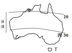 小题3:当重庆处于多雨季节时,北半球是夏季,气压带风带北移,此时南半球是冬季。图中甲地受东南信风带控制,吹东南风,A错。乙地是地中海气候,此时受西风带影响,吹西北风,B对。丙地是亚热带季风性湿润气候,此时是冬季风,吹西南风,C错。丁地是温带海洋性气候,吹西北风,D错。