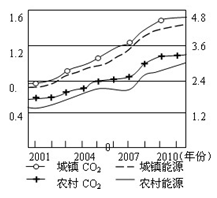 4、单选题 下图为我国2001年-2010年城镇、农村家庭能源消费总量和CO2排放总量变化图。读图完成下列各题。