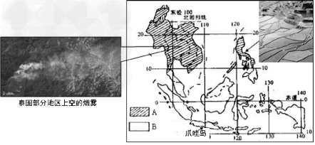 2012年3月,大范围的农业区和森林火灾在东南亚上空制造了厚厚的烟雾和阴霾,笼罩了泰国北部、老挝和缅甸部分地区。火灾区上空的悬浮物微粒浓度达到危险水平,并导致泰国南邦机场航班延误。3月4日,美国宇航局公布了火灾的一幅近景照片。(21分)已有2000年历史的菲律宾水稻梯田由于其一直保留着原始而古老的梯田文化,于1995年被评为世界文化遗产。这里的梯 田多修在海拔2000米的高地上,坡度大、梯田面积小。