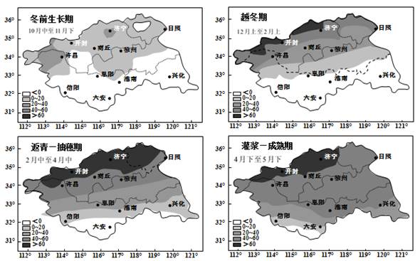 A.灌浆成熟期,区域气温较低 B.灌浆成熟期,区域降水较少 C.冬前生长期,小麦需水量多 D.冬前生长期,区域风力较大 |