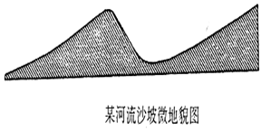 【小题1】由题干可知图形中的微地形是流水搬运、沉积作用形成,它们的区别在于流速的大小,陡坡如遇流水长期侵蚀作用也会变成缓坡,而背向流水的一侧由于受地形阻挡,流速变小,泥沙渐渐沉积而形成陡坡。