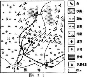 (4)按目前图6-3-1中展示的现状,哪个地点可能会形成城市,用字母F标注在图中。