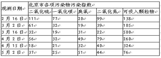 小题2:根据表格分析,北京的首要污染物是可吸入颗粒物。根据表中日期判断为春季,北京可吸入颗粒物较多的原因是春季干旱,多大风天气,大风天气多由冷锋形成。所以本题选择B选项。