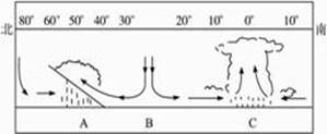本题解析:根据图示可知,A处大约位于北纬60°附近,并且多极锋形成的降水。所以A为副极地低气压带,该区域降水属于气流抬升过程中降温凝结致雨。C位于赤道附近,应该属于对流雨。该雨多形成在每天气温最高的午后。B地区位于北纬30°附近,属于副热带低气压带,降水主要在大陆东岸,主要是季风和台风的影响。