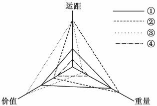 小题3:受交通制约最明显的货物应该在运距和重量上比较大,由图中可知交通制约最明显的货物是②。