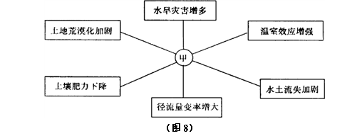 1、单选题 地理环境中各事象之间是相互联系的,若某事象发生变化就会给其他事象带来影响,甚至发生一系列的变化。读图8回答以下各题。