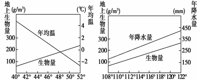 4、单选题 生物量一般是指生物在某一特定时刻单位空间的个体数、重量或其含能量。下图是“我国某区域地上生物量、年均温和年降水量随经纬度的线性变化示意图”。读图回答下列各题。