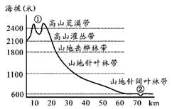 2、单选题 下图为我国42°N某山地北坡自然带谱分布图,读图回答1—3题。
