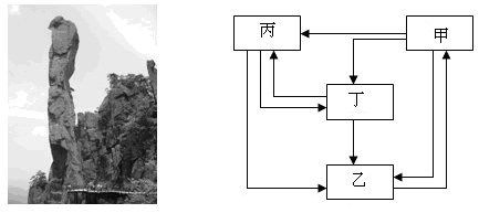 【小题1】据材料中信息可知,巨蟒出山是巨型花岗岩石柱,花岗岩属岩浆岩。根据右图中地质循环分析,乙为岩浆,甲为岩浆岩,丙、丁是变质岩或沉积岩。故选A。