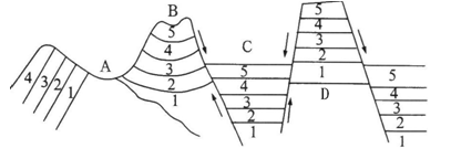 (3)A、B两处为褶皱,以水平运动为主;C、D两处为断层,垂直运动为主。