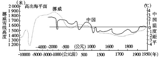 3、单选题 读“挪威雪线海拔和中国气温距平(与平均气温的差值)变化图”,完成下两题。