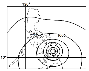 2013年11月8日当地时间凌晨4时多,台风“海燕”从菲律宾东海岸登陆,然后由东到西横扫该国中部多个地区。此次台风造成大规模损坏,死亡人数达上万人。下图为局部地区气压分布状况图(等值距为4 hpa)。读图,回答问题。