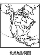 (2)北美地形南北纵列分布,中部地势平坦开阔,有利于极地冷空所长驱南下(4分)