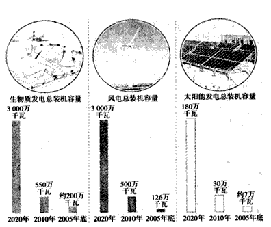 3、综合题 利用风力、太阳能、生物能等可再生能源发电是当今新能源发电的主流。作为化石能源发电和水电的重要补充,新能源发电日益受到世界各国的关注。读下图,回答下列问题。
