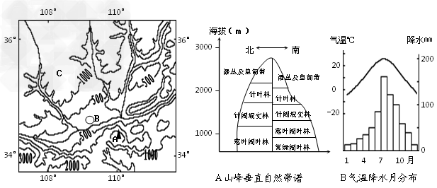 1、综合题 读“我国某地区地形图以及图中A山峰垂直自然带谱图和B点所在地区的气温降水月分布图”,回答下列问题: