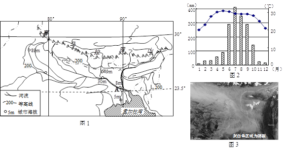 材料一:图1中的恒河平原是世界人口最稠密的地区之一,农耕比重大,冬季秸秆燃烧量大。图2是图1中A城的气温曲线和降水量柱状图。