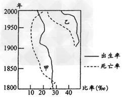 5、多选题 读“甲、乙两国人口出生率与死亡率变化曲线图”,完成1~2题。