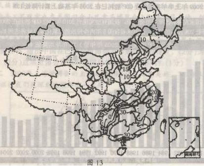 材料二:1954年~2008年我国冷冻灾害频次分布图(图13)。