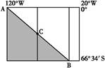 小题1:从图上可以看出,此时A点为120°W、赤道和晨线的交点,其地方时为6时,则计算得20°W的地方时为12时40分,30°W的地方时为12时。根据“图示范围仅阴影区为黑夜,其他地区为白天”判断图示晨线与纬线的切点位于66.5°S以南,该切点的地方时应为12时,即30°W,故B点的地方时小于12时,C 为ACB的中点,故C点的地方时小于9时,D项正确。