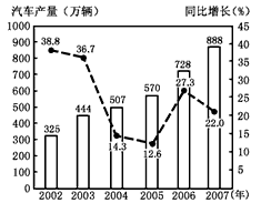 5、单选题 读2002—2007年我国汽车产量走势图,回答1—2题。