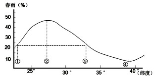 2、单选题 下图表示沿115°E经线春雨占全年降水的比重。读图回答1—2题。