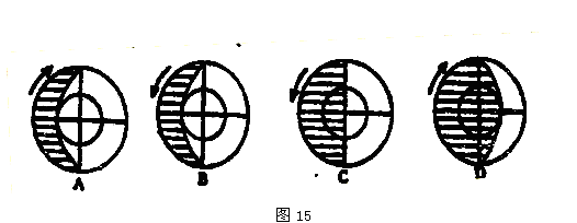 F.北半球各地正午日影均朝向北 参考答案:(1)秋分? 9月23日? 0°?南? 本题解析:略 本题难度:简单 2、填空题 该图,阴影表示黑夜,内圆表示极圈,中心表示极点,箭头表示地球自转方向,。其中日期相同的是 (?)? 参考答案:BD 本题解析:本题考查光照图。A表示南极圈内出现极昼,判断为冬至日;B图表示北极圈内出现极昼;判断为夏至日;C图表示晨昏线与经线重合,为春秋分日;D图表示南极圈内出现极夜,判断为夏至日,故选BD。 本题难度:一般 3、单选题 下两图是同一时刻地球上两区域昼夜分布情况,读图回答下列各题。 |