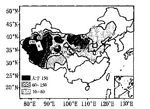 2、综合题 目前,频发的沙尘暴越来越引起人们的关注。读中国沙尘天气日分布图,完成各题。