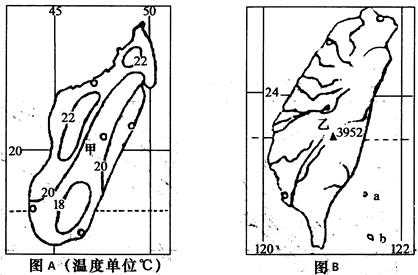 (2)图A中所示的甲岛20℃等温线弯曲明显,主要影响因素是?.(1分)