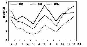 【小题1】通过读图分析:天津和河北雾霾日数冬季大于夏季,北京雾霾日数夏季大于冬季,因此A和B错;北京冬季雾霾日数低于天津,D错;根据图中雾霾日数估算,三地区雾霾日数夏季差异比其它季节都大,C正确。