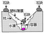 【小题1】沙漠中气候干旱,晴天多,太阳辐射强,从图中可见,地面的水分在太阳照射之下水分蒸发出来,而又被塑料膜拦截,塑料膜随坑自然凹陷,坑面与塑料膜形成弧形,水珠在自身重力作用下汇集与凹陷部位降落到容器中。故动力为太阳辐射能和重力能B正确。