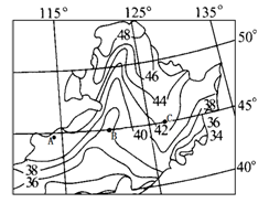 (1)等值线呈东西走向。南部受西风带影响时间短,北部受西风带影响时间长。(6分)