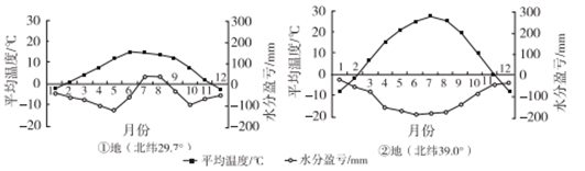 4、单选题 水分盈亏量是降水量减去蒸发量的差值,反映气候的干湿状况。当水分盈亏量>0时,表示水分有盈余,气候湿润;当水分盈亏量<0时,表示水分有亏缺,气候干燥。下图为我国两地年内平均水分盈亏和湿度曲线图。读图,完成下面小题。