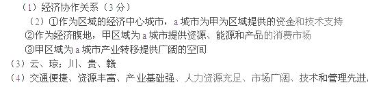 (2)分析图中甲区域与a城市经济发展的相互关系(6分)