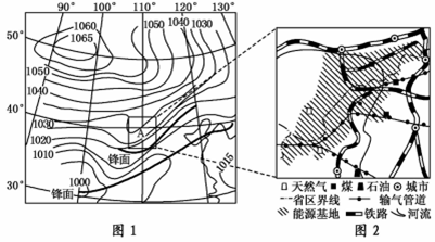 2、综合题 图1是1月某时地面天气图(单位:百帕)。读图回答问题。