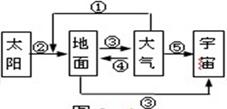 3、单选题 下图中各箭头及其代表符号①②③④⑤表示太阳、地面、大气、宇宙空间之间的热力作用,其中包括太阳辐射、地面辐射、大气辐射、大气逆辐射、削弱作用(吸收、反射和散射),完成下列问题。